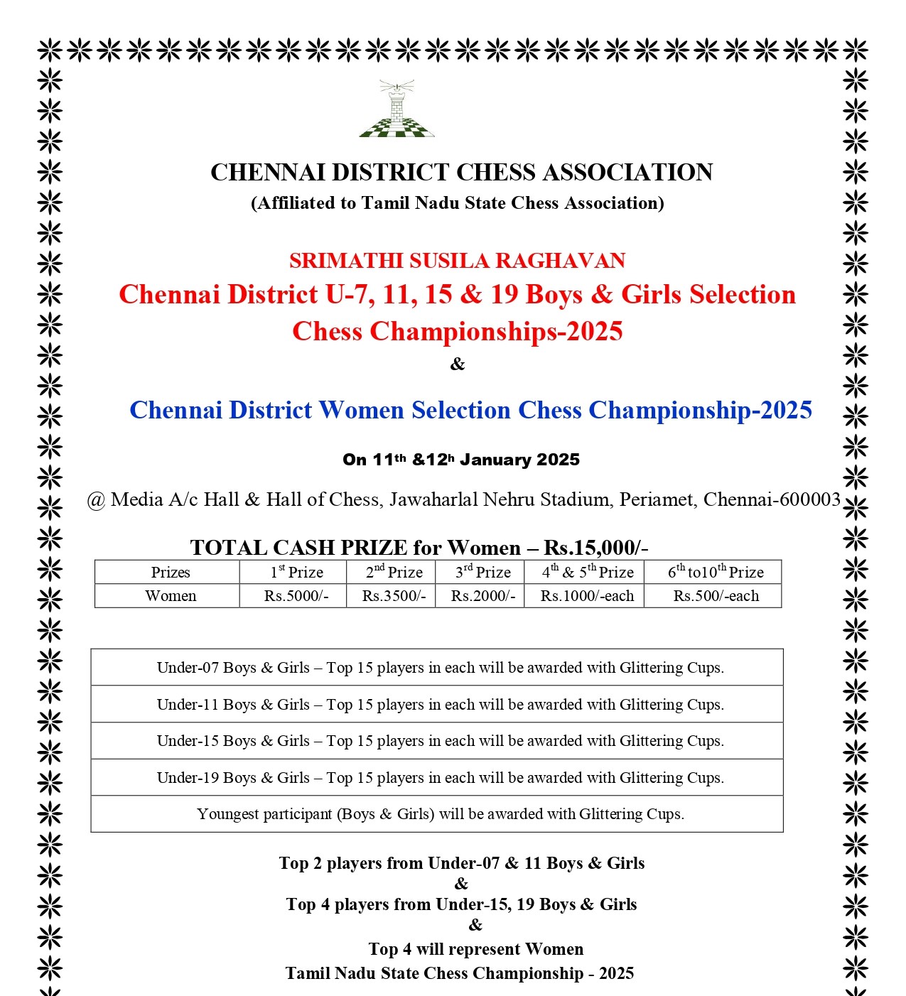 - Jawaharlal Nehru Stadium, Periamet, Chennai – 600 003