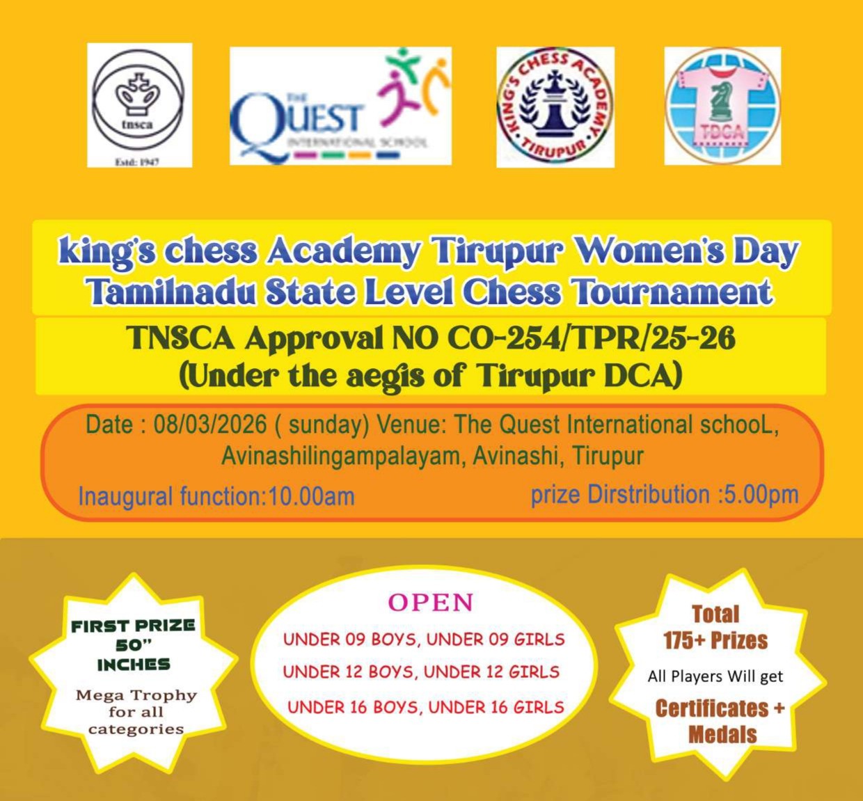 King’s Chess Academy Tirupur Women’s Day State Level Chess Tournament – 8 MARCH